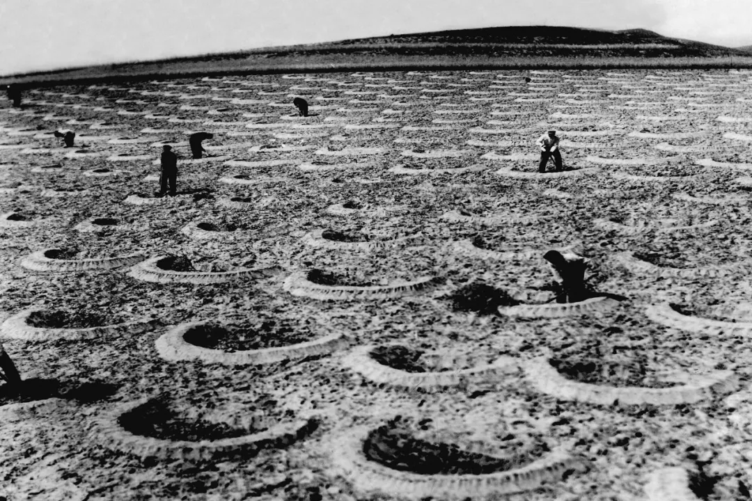 20世紀(jì)六七十年代,右玉縣群眾在荒山荒坡植樹(翻拍照片)。新華社發(fā)