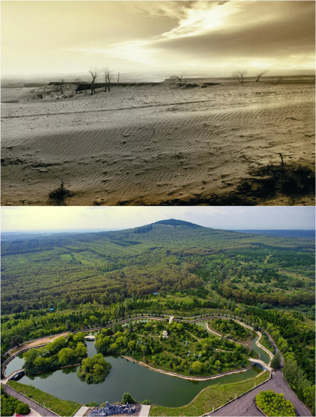 拼版照片:上圖為治理前,右玉縣的荒涼沙地(資料照片);下圖為右玉縣小南山森林公園(新華社記者曹陽(yáng)8月7日攝)。