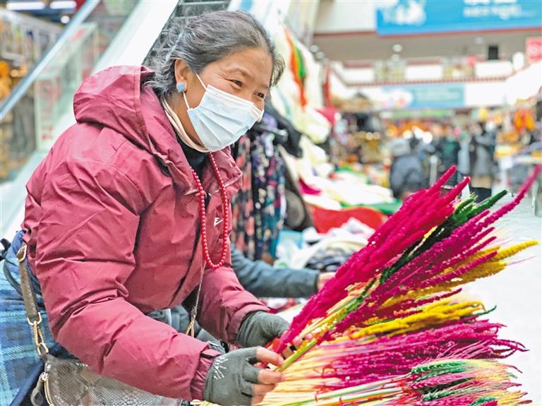 今年是次卓瑪在八廓商城年貨攤位擺攤的第8年,隨著老顧客的不斷增多,她每年對(duì)自己制作“羅薩美朵”的要求也越來越高?!胞溗氲娘枬M度和染色均勻度都需要精心選、細(xì)心染,雖然每把只賣5元,但一年也就售賣一次?!贝巫楷斮|(zhì)樸地說。