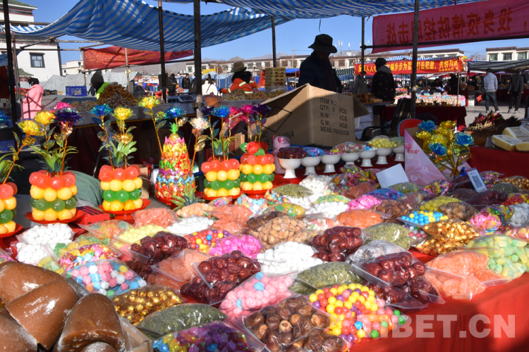 拉巴頓珠正忙碌著擺售賣年貨。喧鬧聲、音樂聲交織在一起,奏響了迎接新年的華美樂章。拉巴頓珠告訴記者,賣自家制作的年貨有幾天了,生意好得很。