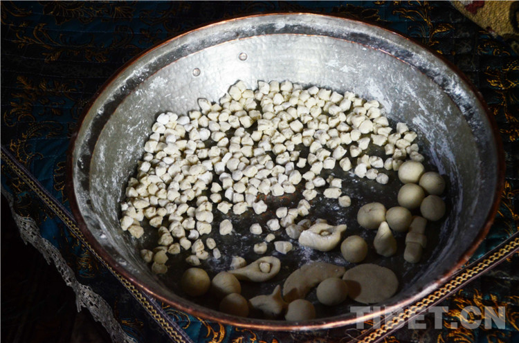 估量著量差不多夠一家人吃后,就開始準(zhǔn)備晚上的重頭戲——在面團(tuán)中包入辣椒、羊毛、木炭等物品,就像春節(jié)時(shí)餃子里的硬幣一樣,古突中包入的物品也有著不同的意義。比如白羊毛寓意性情溫和,辣椒寓意牙尖嘴利等。同時(shí)還捏出了太陽、月亮等形狀的面團(tuán),也都有著吉祥美好的寓意。
