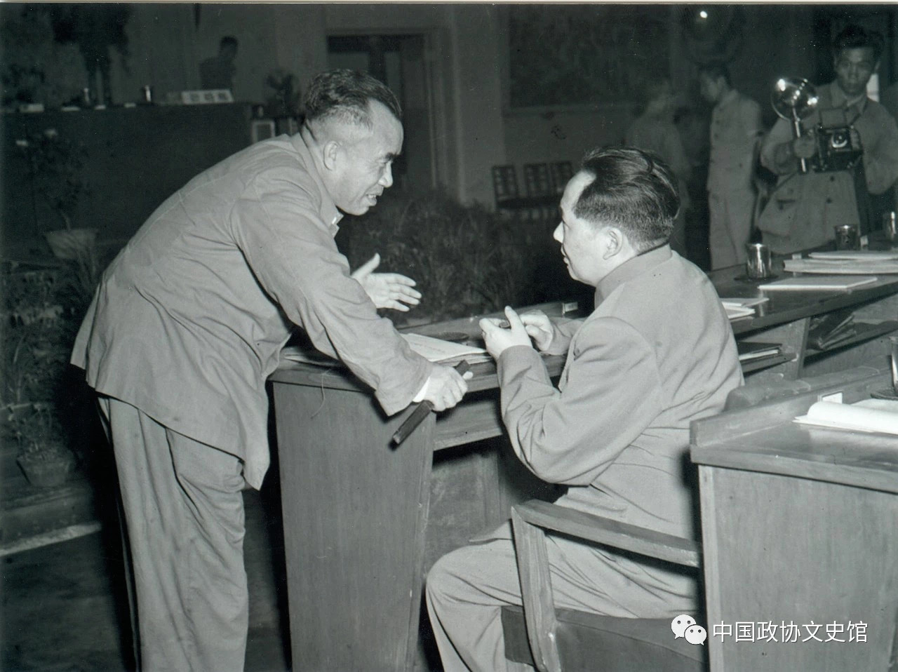 1950年6月23日,毛主席在大會休息時與朱德總司令交談。