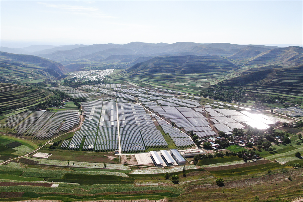 這是2022年6月15日在甘肅省定西市通渭縣榜羅鎮(zhèn)四新村拍攝的集中式光伏電站(無人機照片)。新華社記者 馬希平 攝