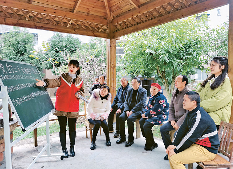圖為2022年11月30日,四川省眉山市仁壽縣黑龍灘鎮(zhèn)流動“小黑板”宣講小分隊(duì)在四海社區(qū)宣講黨的二十大精神。 人民圖片 潘帥/攝
