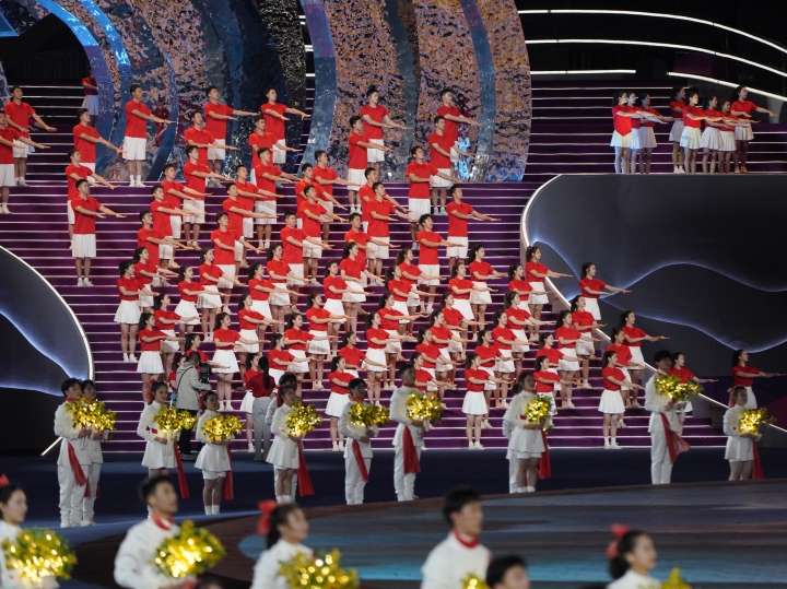 10月22日杭州亞殘運會開幕式上,表演者用手語“唱”國歌。潮新聞記者 楊朝波 攝