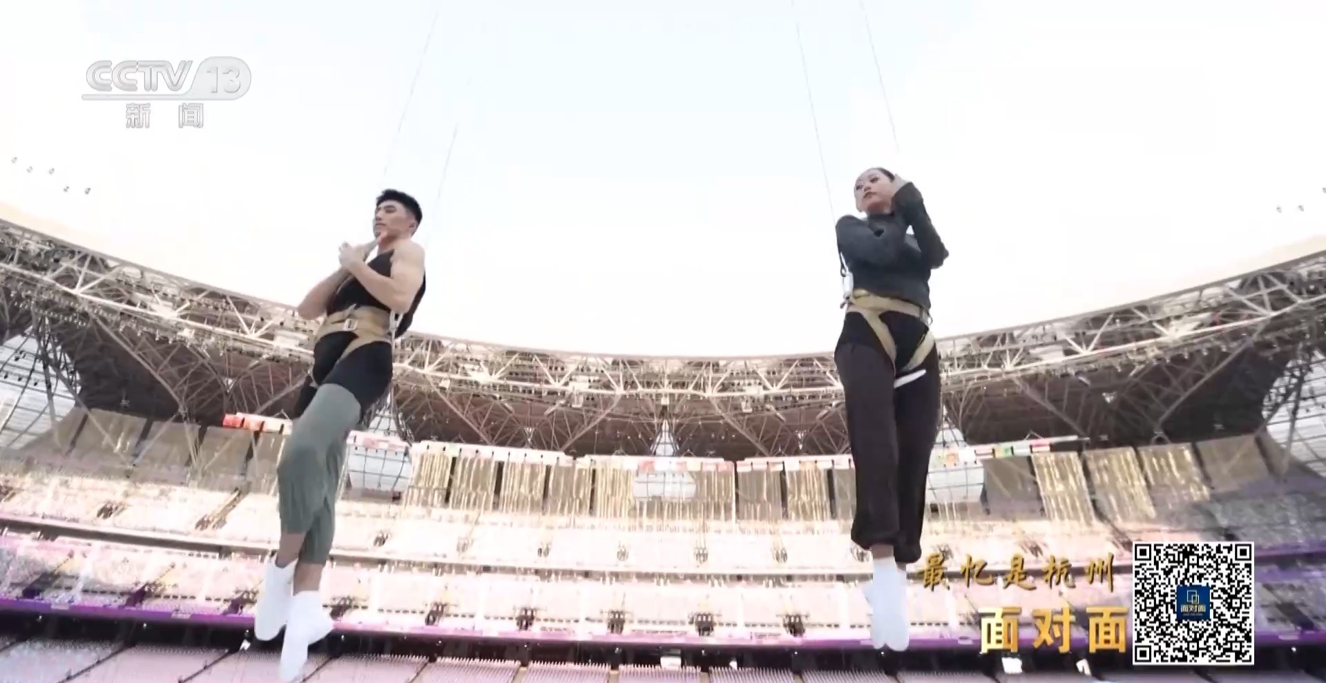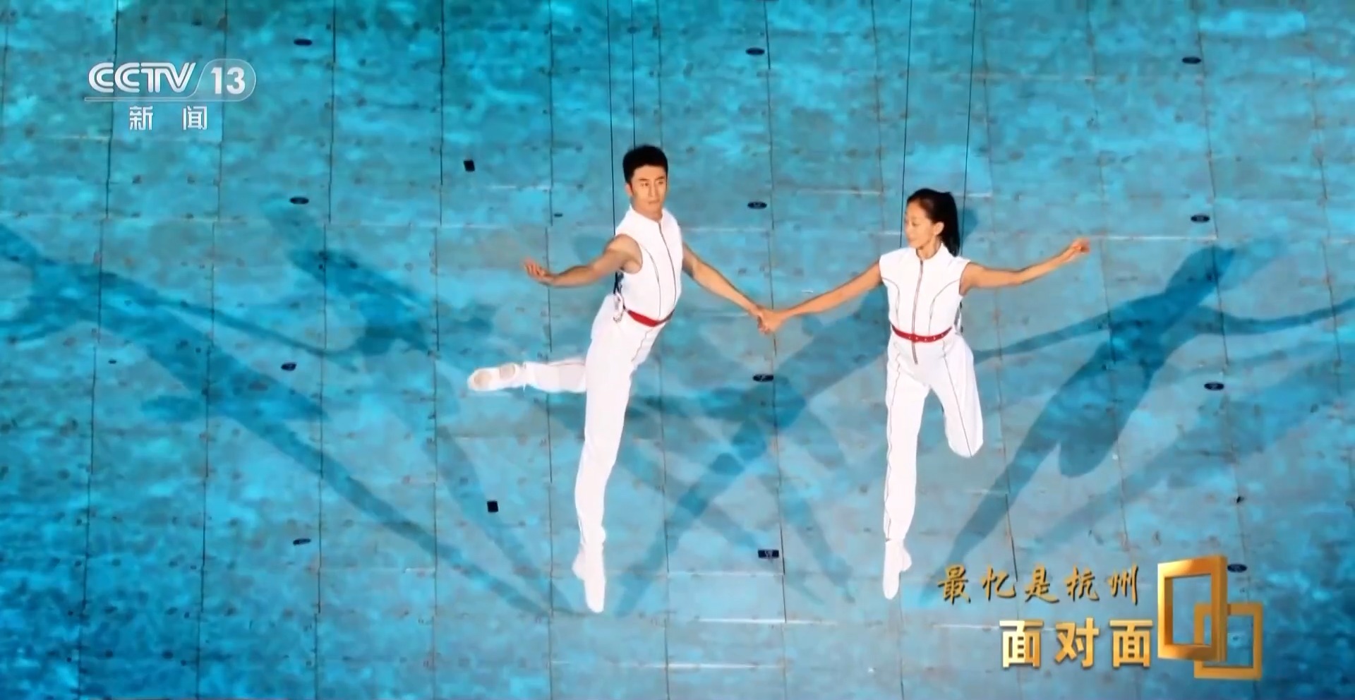 這是《錢塘潮涌》篇章中的雙人3D威亞節(jié)目,展現(xiàn)了勇立潮頭的波瀾壯闊場景,這也是世界上首次在大型運動場空間中使用雙3D威亞技術。