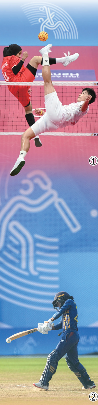 圖①:9月24日,藤球女子單組團(tuán)體預(yù)選賽,泰國體育代表團(tuán)選手曼立卡·汶托(前)對(duì)陣印度尼西亞體育代表團(tuán)選手。