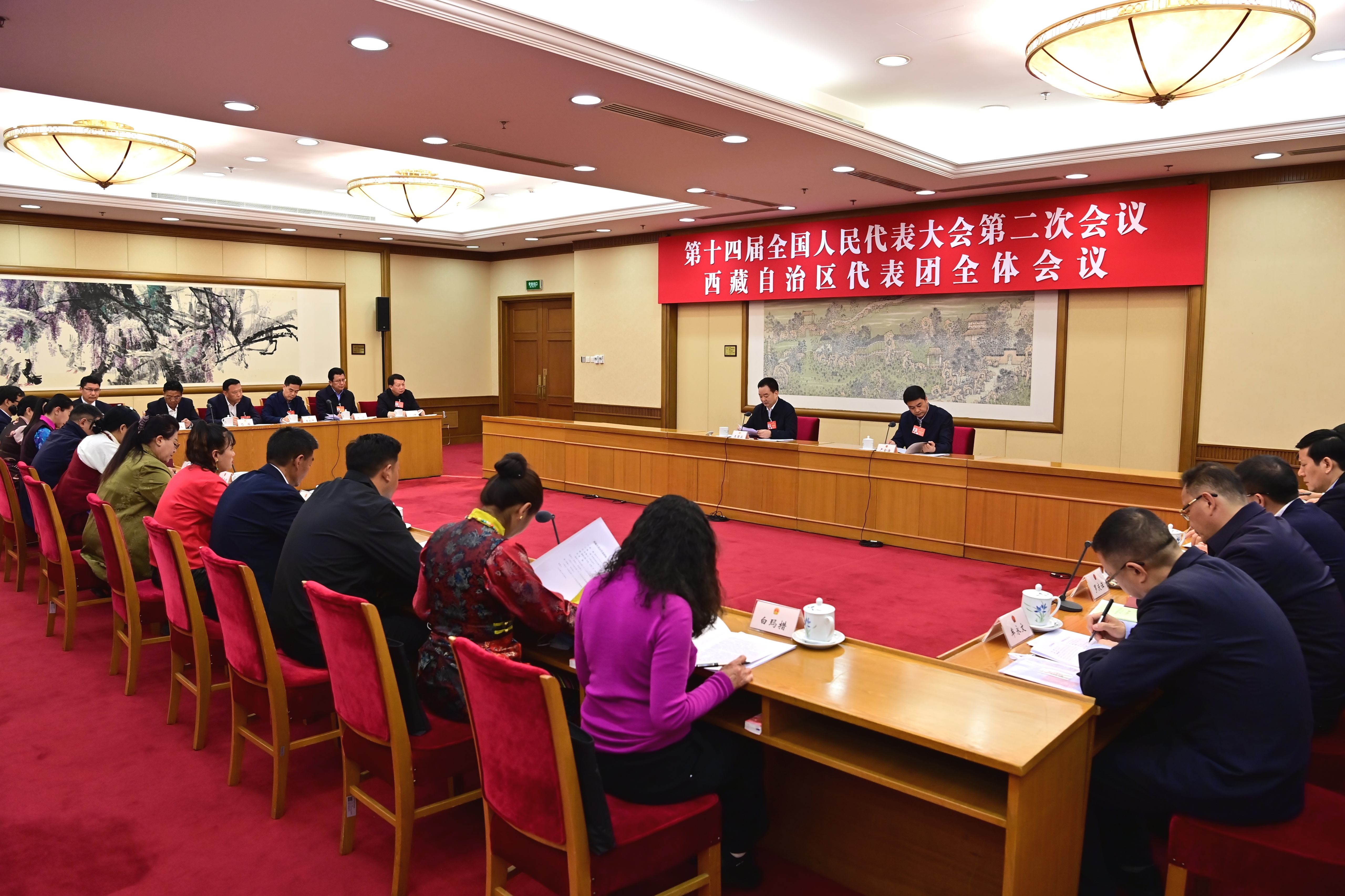 3月6日,出席十四屆全國人大二次會議的西藏代表團在北京人民大會堂西藏廳舉行開放團組會議,審議政府工作報告并回答記者提問。