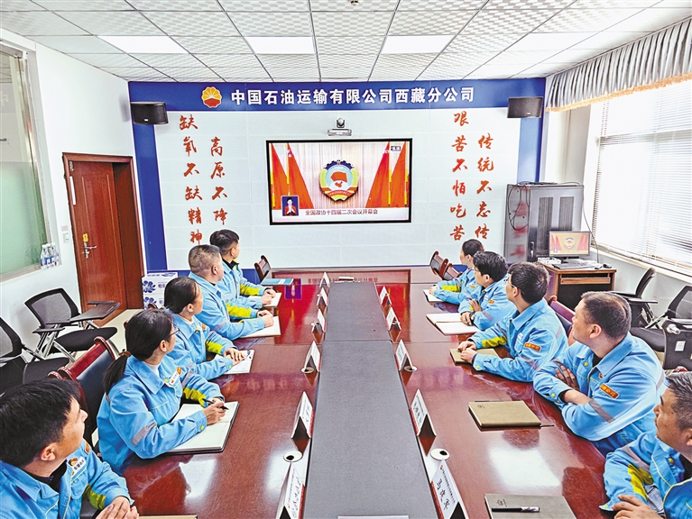 中國石油運(yùn)輸西藏分公司組織員工收看全國政協(xié)十四屆二次會(huì)議開幕會(huì)。格桑旦增 記者 次仁平措 攝