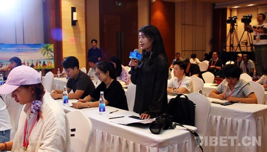 圖為中國西藏網(wǎng)記者在第十二屆全國少數(shù)民族傳統(tǒng)體育運(yùn)動會黑龍江、福建、西藏代表團(tuán)新聞發(fā)布會上提問 攝影:劉莉