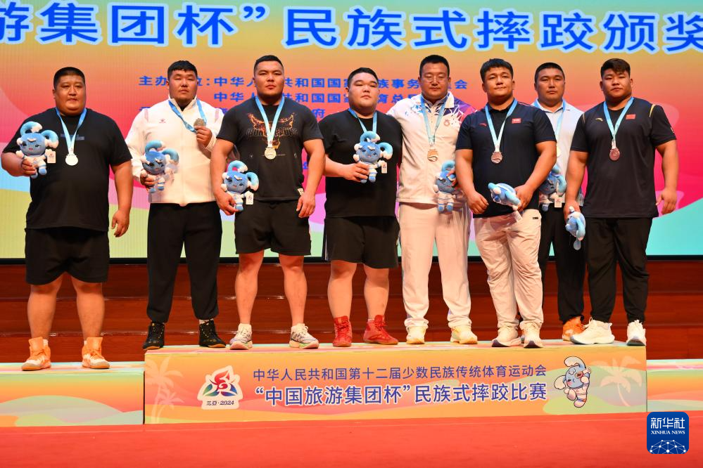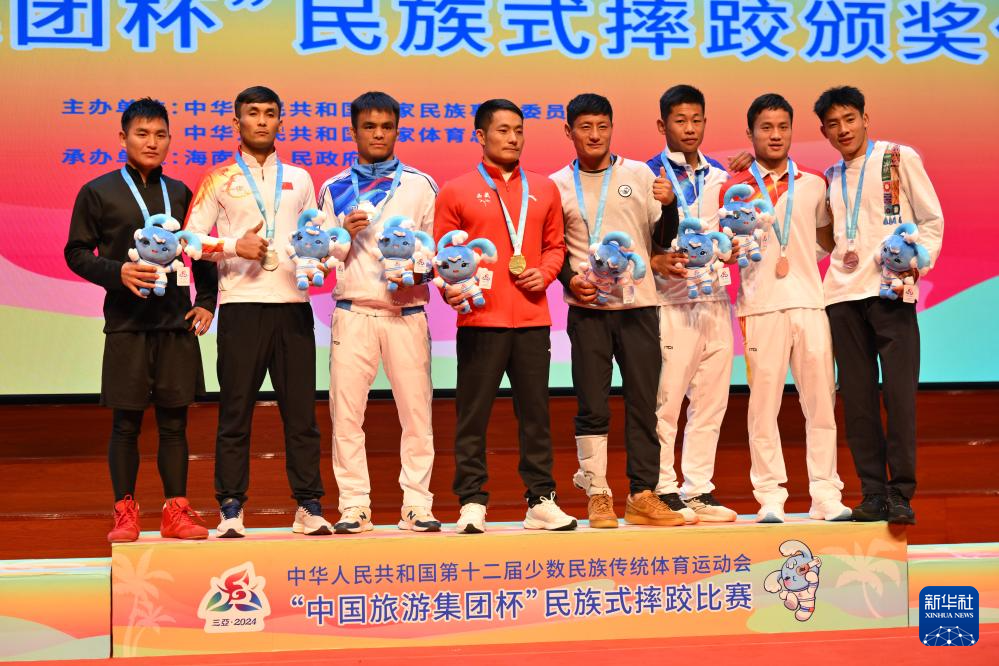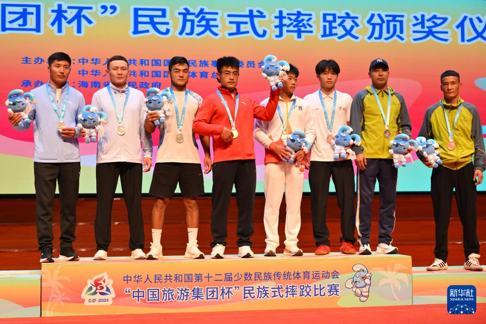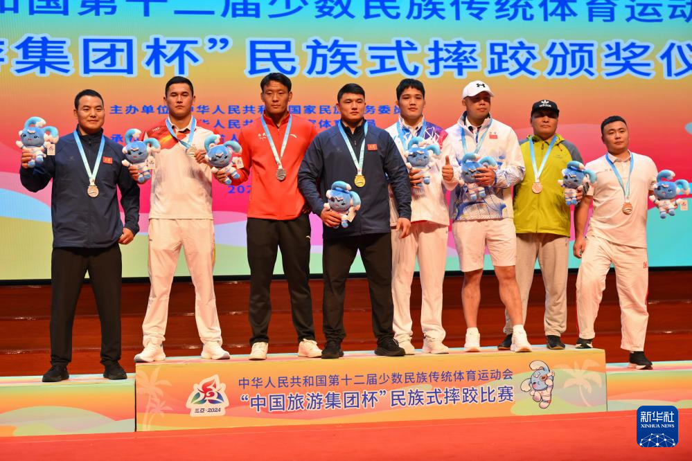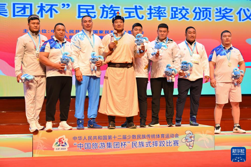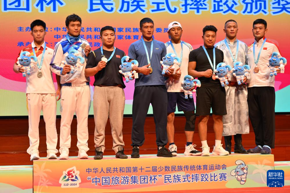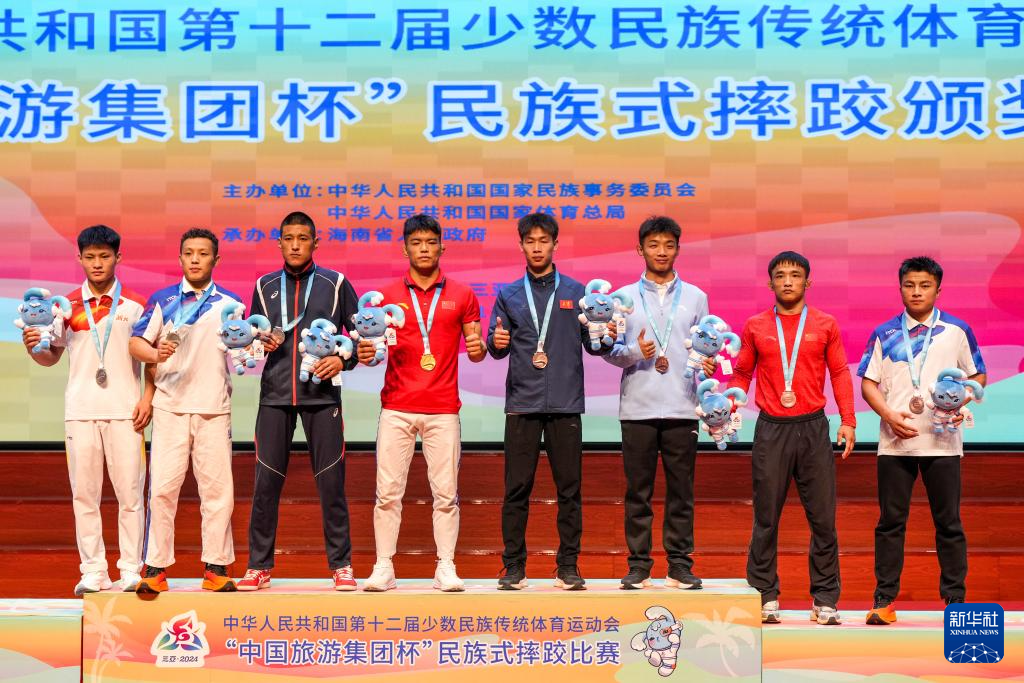 當(dāng)日,第十二屆全國少數(shù)民族傳統(tǒng)體育運動會民族式摔跤項目頒獎儀式在海南省三亞市舉行。