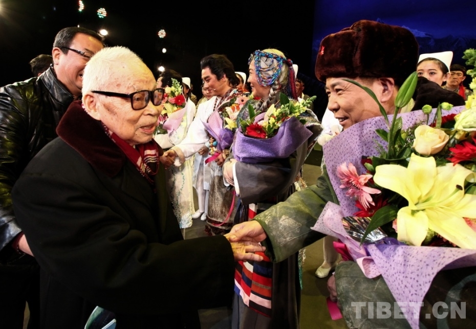 圖為北京建藏援藏工作者協(xié)會(huì)學(xué)習(xí)指導(dǎo)老師陰法唐將軍在中國評(píng)劇院所創(chuàng)作的評(píng)劇《藏地彩虹》試演結(jié)束后,上臺(tái)握手祝賀(唐召明2017年12月10日攝)