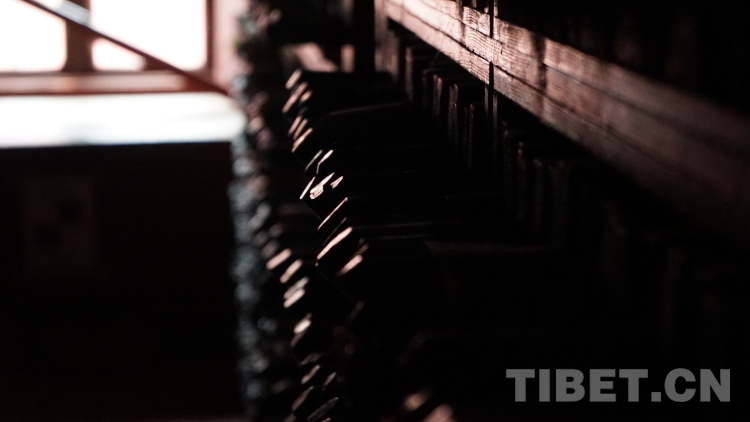 圖為德格印經(jīng)院內(nèi)擺滿印版的木架,因為印經(jīng)院不通電、不掌燈,所以內(nèi)部光線較為昏暗 攝影:張宇