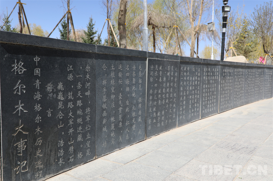 圖為公園內(nèi)的花壇墻磚上刻錄著格爾木大事記 攝影:王茜