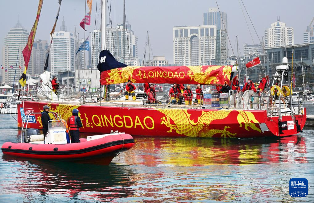 參加2023-24克利伯環(huán)球帆船賽的青島號(hào)大帆船抵達(dá)青島奧林匹克帆船中心(3月22日攝)。