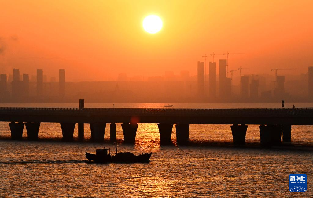 漁船在晨光中從青島膠州灣跨海大橋旁駛過(1月1日攝)。