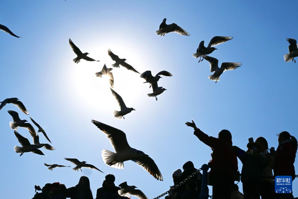 游客在青島市市南區(qū)棧橋景區(qū)觀賞海鷗(1月24日攝)。