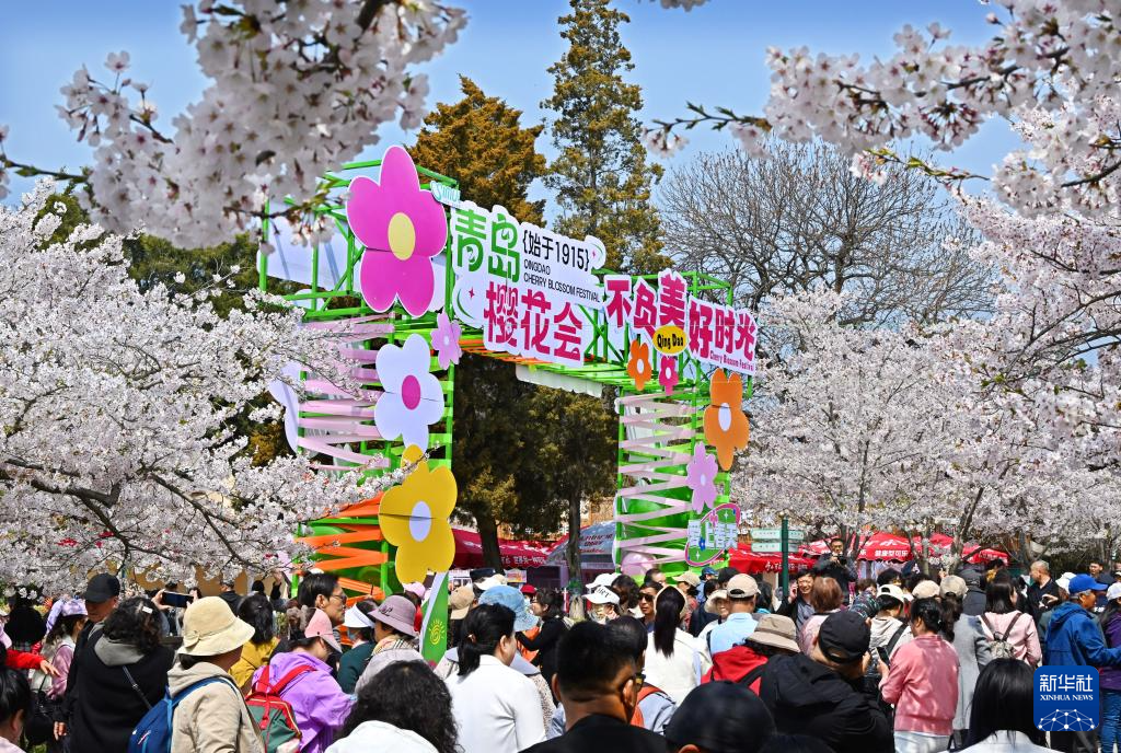 人們?cè)谇鄭u中山公園觀賞櫻花(4月11日攝)。