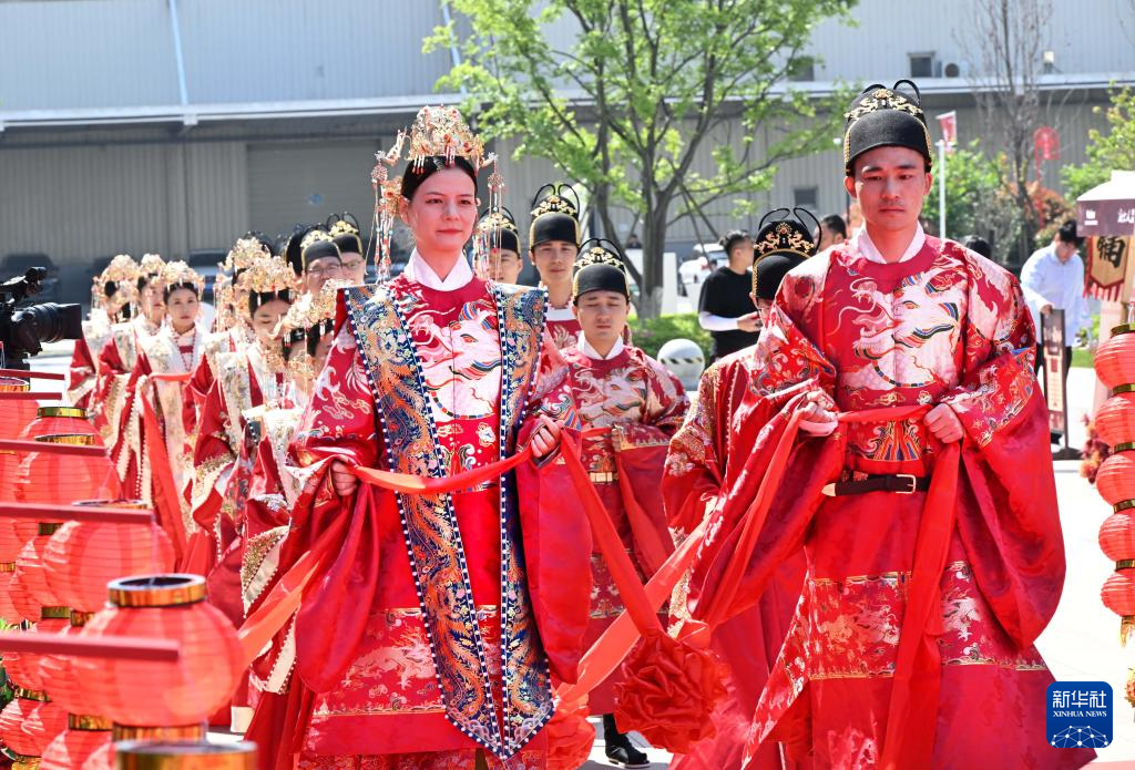 新人在青島市嶗山區(qū)新時(shí)代文明實(shí)踐廣場(chǎng)參加集體婚禮(5月9日攝)。