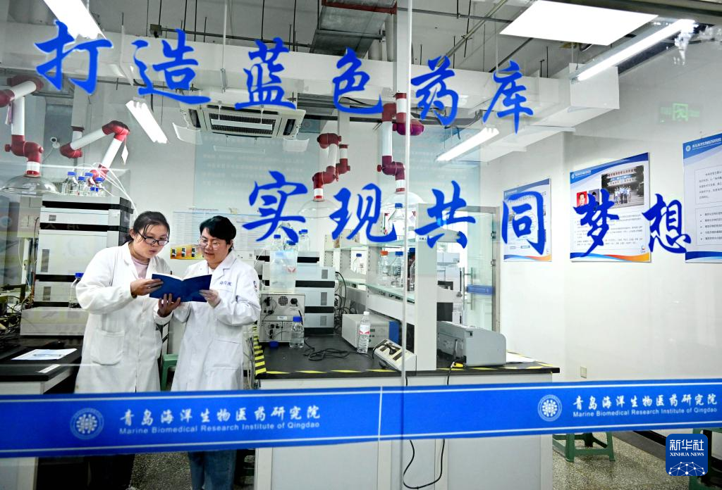 青島海洋生物醫(yī)藥研究院兩名科研人員在實(shí)驗(yàn)室交流(6月7日攝)。