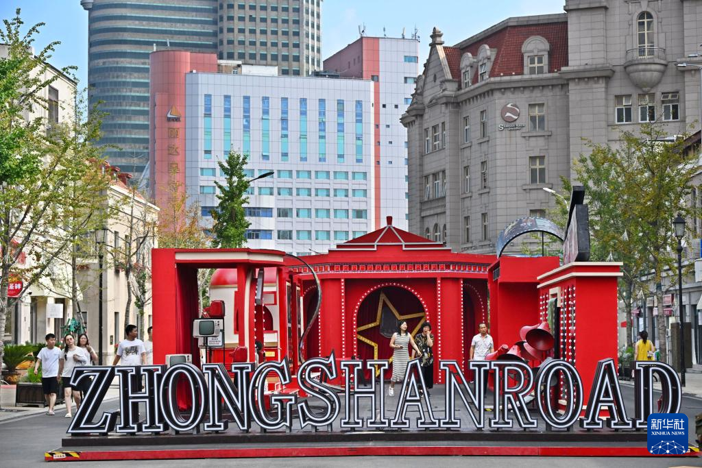 人們?cè)谇鄭u市南區(qū)中山路上游玩(8月17日攝)。
