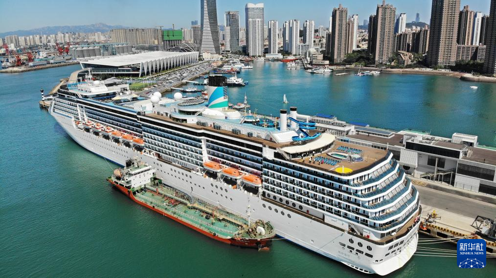 巴哈馬籍“愛達(dá)·地中海”號(hào)郵輪靠泊山東青島國(guó)際郵輪母港(6月27日攝,無人機(jī)照片)。