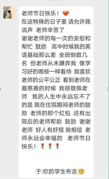 上大學時,?我?guī)е鴱哪抢飳W到的堅韌和自信,?踏入了這個全新的世界。?雖然大學生活與高中截然不同,?挑戰(zhàn)也更多,?但我始終記得您的教誨,?知道只要努力,?就沒有什么是不可能的。??每當遇到困難,?我都會告訴自己,?就像您曾經(jīng)幫助我克服英語難題一樣,?我也能在這里找到屬于自己的路,于是更加堅定了前進的決心。?