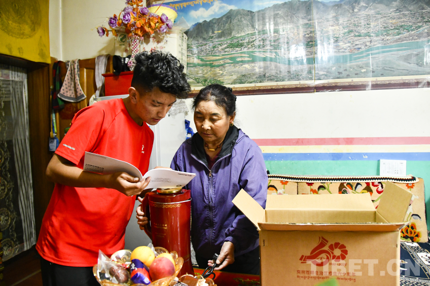 圖為卓嘎與兒子羅布次仁一起鄭重打開中央代表團贈送的全自動酥油茶壺包裝 攝影:趙振宇