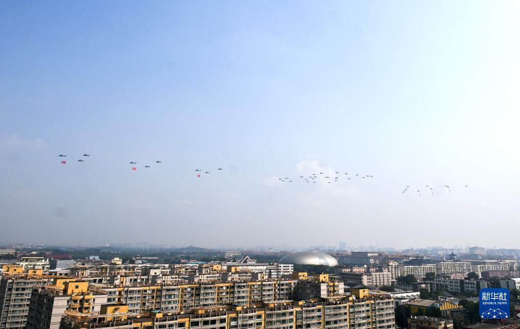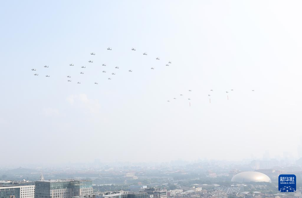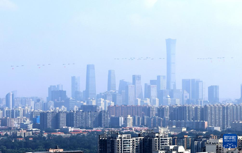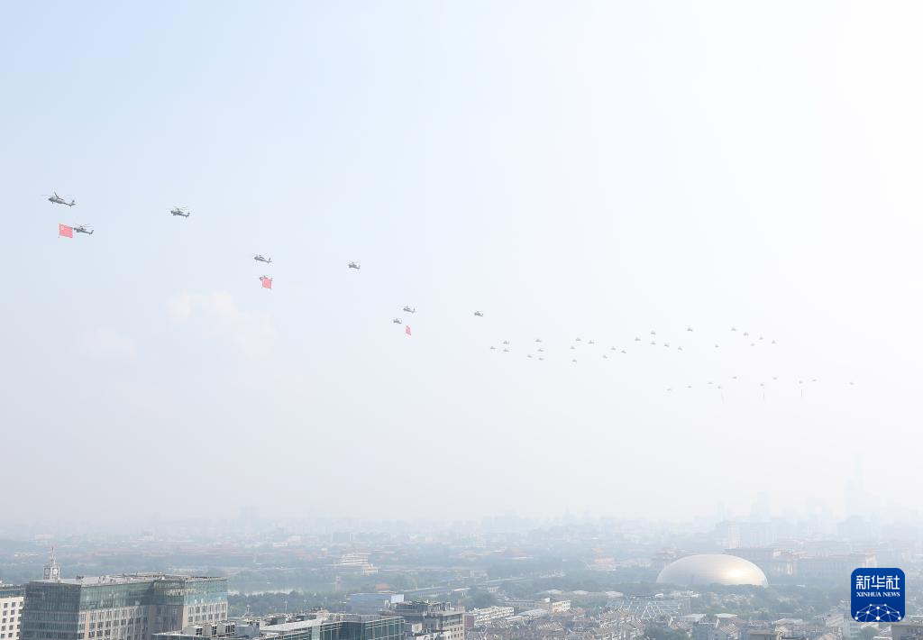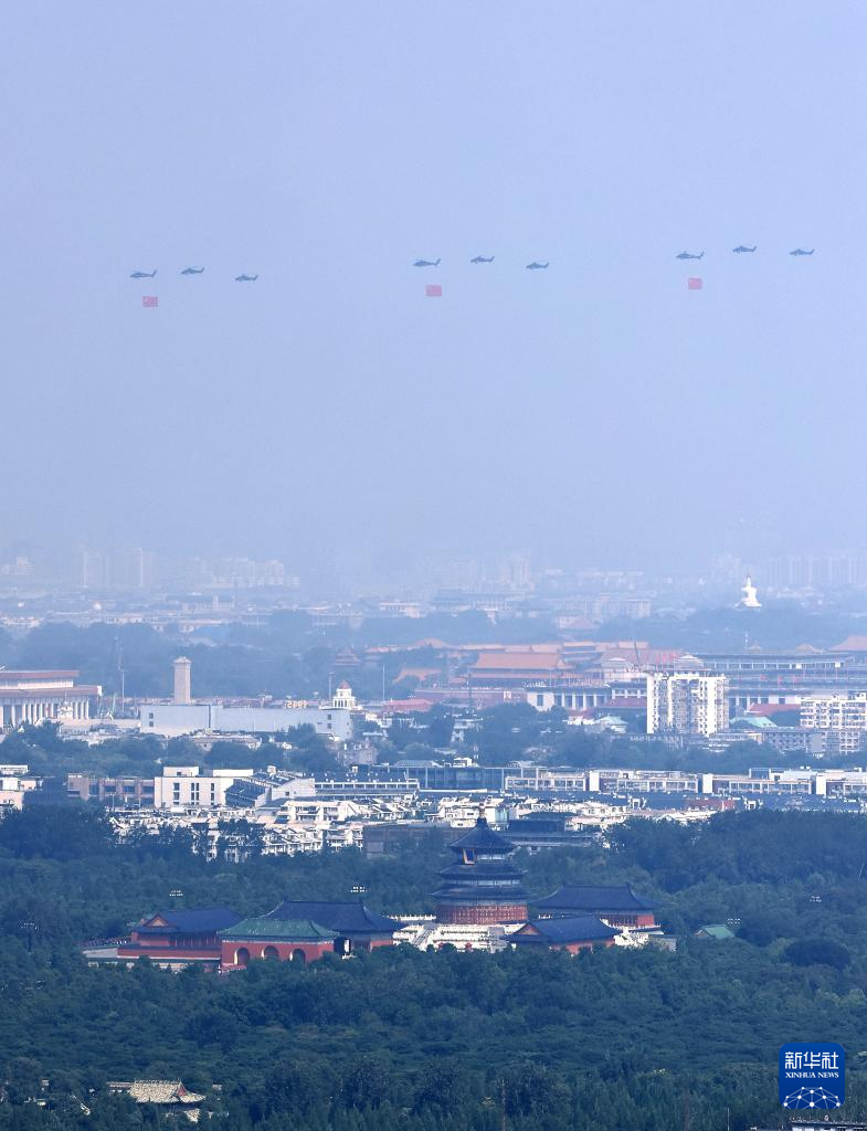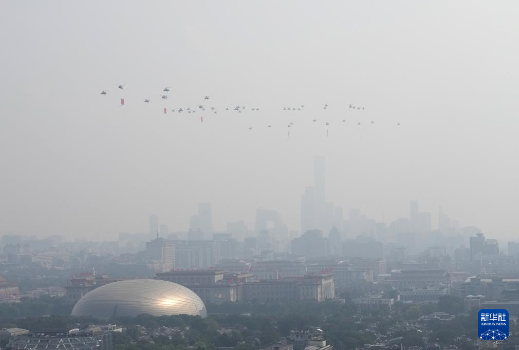 9月3日,紀(jì)念中國人民抗日戰(zhàn)爭暨世界反法西斯戰(zhàn)爭勝利80周年大會(huì)在北京隆重舉行。這是空中護(hù)旗梯隊(duì)。