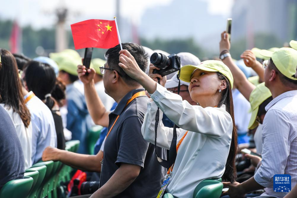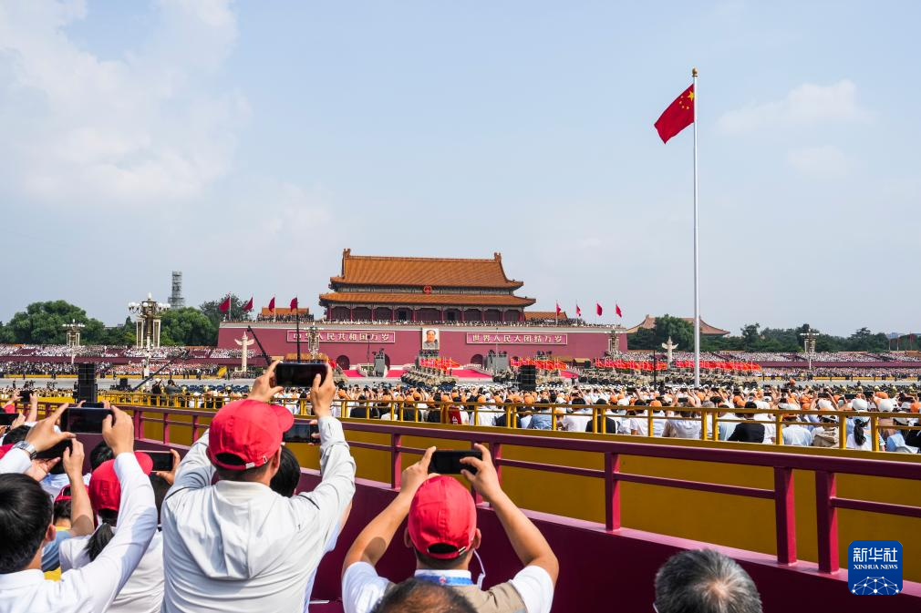 9月3日,紀(jì)念中國人民抗日戰(zhàn)爭暨世界反法西斯戰(zhàn)爭勝利80周年大會(huì)在北京隆重舉行。這是觀眾拍攝手中的國旗。