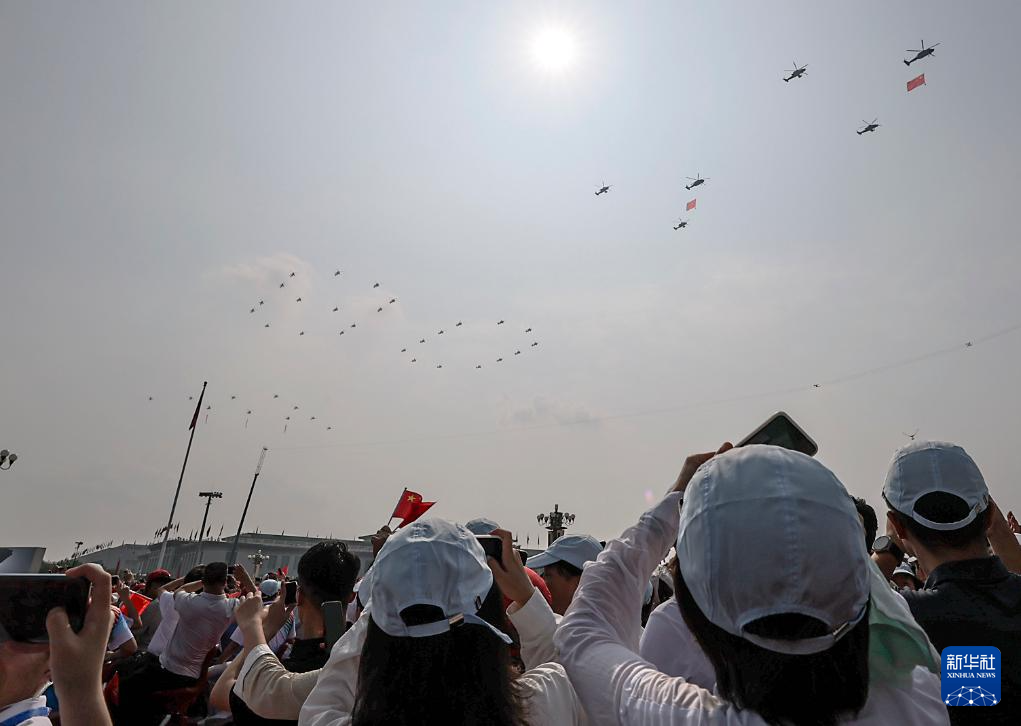 9月3日,紀(jì)念中國人民抗日戰(zhàn)爭暨世界反法西斯戰(zhàn)爭勝利80周年大會(huì)在北京隆重舉行。這是觀眾拍攝空中護(hù)旗梯隊(duì)通過天安門廣場。