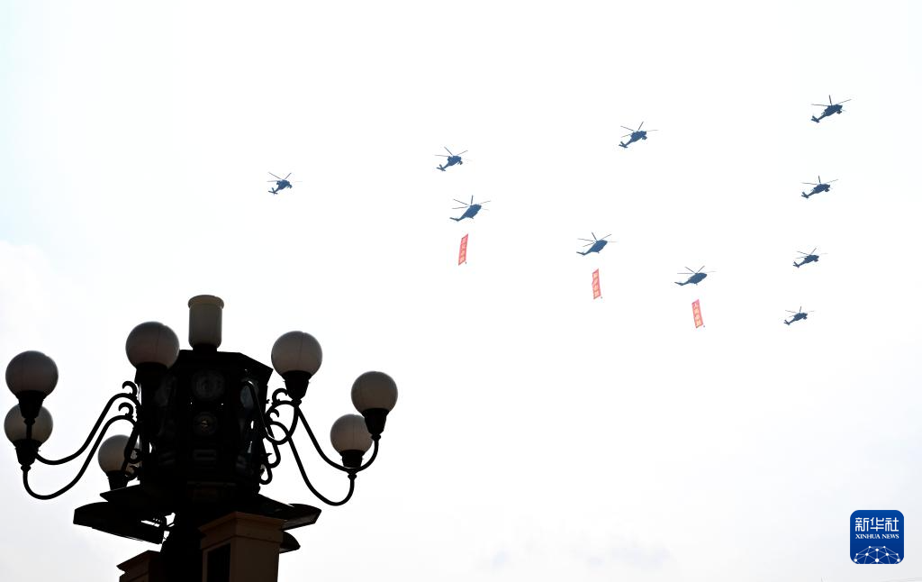 9月3日,紀(jì)念中國人民抗日戰(zhàn)爭暨世界反法西斯戰(zhàn)爭勝利80周年大會(huì)在北京隆重舉行。這是空中護(hù)旗梯隊(duì)通過天安門廣場。