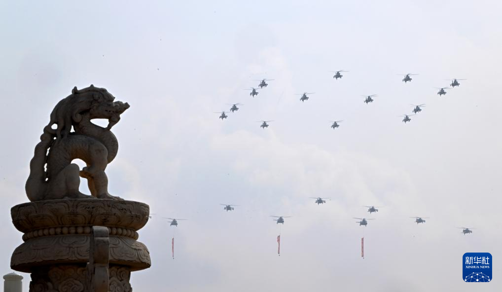 9月3日,紀(jì)念中國人民抗日戰(zhàn)爭暨世界反法西斯戰(zhàn)爭勝利80周年大會(huì)在北京隆重舉行。這是空中護(hù)旗梯隊(duì)通過天安門廣場。