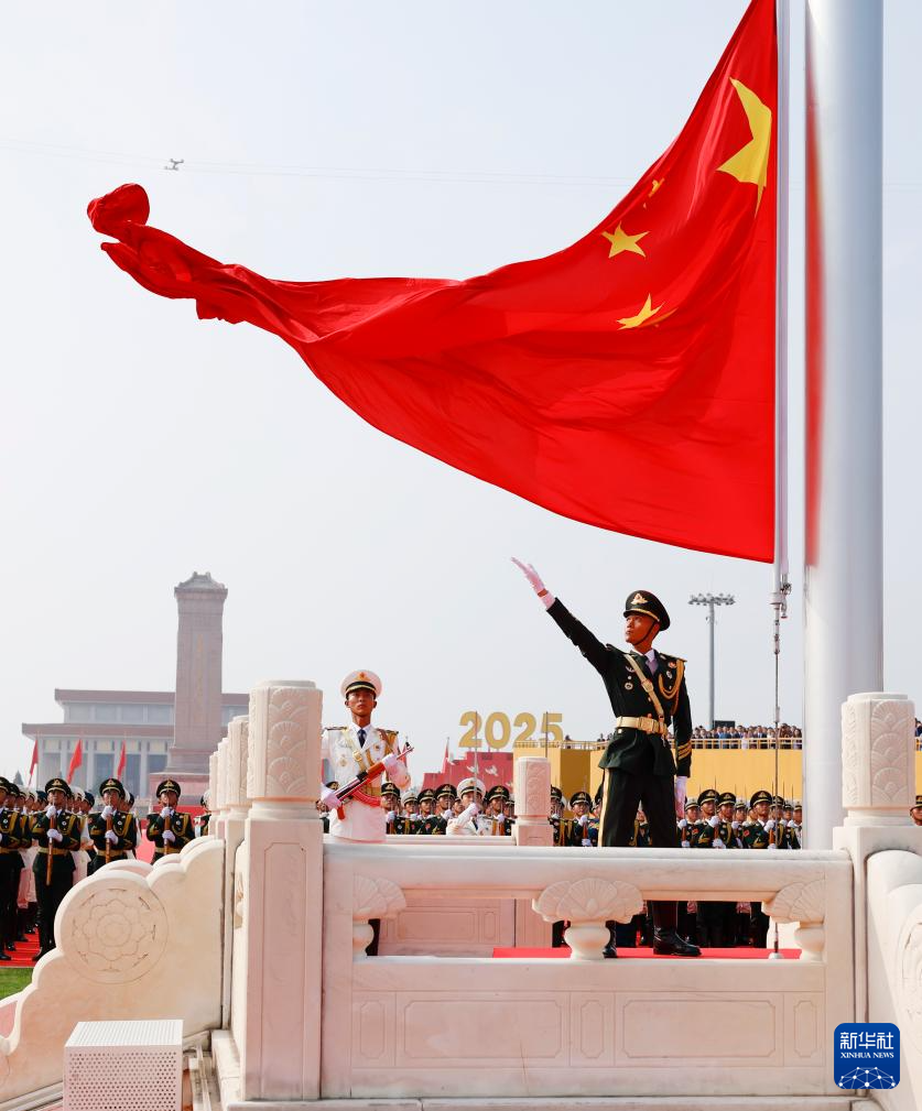 9月3日,紀(jì)念中國人民抗日戰(zhàn)爭暨世界反法西斯戰(zhàn)爭勝利80周年大會(huì)在北京隆重舉行。這是天安門廣場舉行隆重的升國旗儀式。