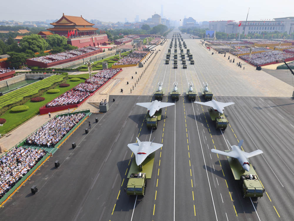 2025年9月3日,紀(jì)念中國人民抗日戰(zhàn)爭暨世界反法西斯戰(zhàn)爭勝利80周年大會(huì)在北京隆重舉行。這是裝備方隊(duì)接受檢閱。新華社記者 劉續(xù) 攝