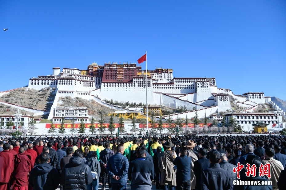 3月28日,西藏各族各界人士聚集在拉薩布達(dá)拉宮廣場(chǎng),升國(guó)旗、唱國(guó)歌,參加西藏百萬農(nóng)奴解放66周年紀(jì)念活動(dòng)。圖為升國(guó)旗儀式現(xiàn)場(chǎng)。