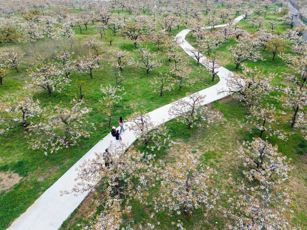 4月3日,游客在梨園內(nèi)賞花(無人機(jī)照片)。時下,山東省滕州市柴胡店鎮(zhèn)近萬畝梨園進(jìn)入盛花期,梨花競相綻放。新華社記者 朱崢 攝