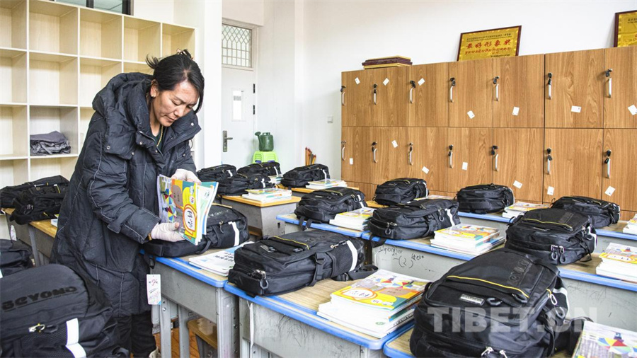 圖為日喀則市定日縣受地震影響的災(zāi)區(qū)學(xué)校即將迎來2025年春季學(xué)期正式開學(xué),老師正在為即將到校的學(xué)生分發(fā)教材與學(xué)習(xí)用具。(攝于2025年3月1日) 攝影:趙振宇
