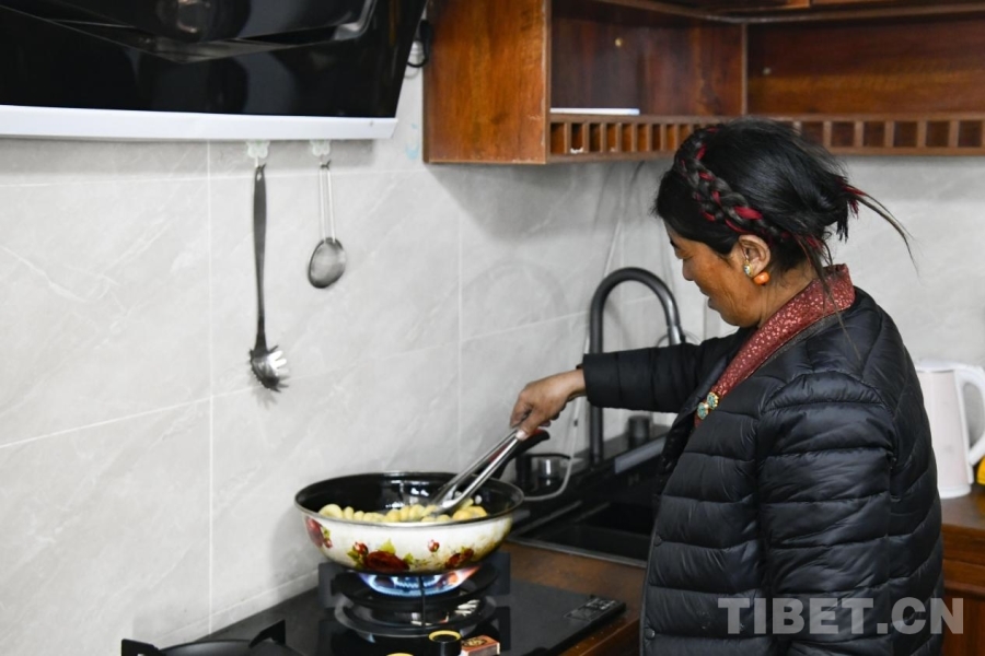 圖為薩迦縣雄麥鄉(xiāng)扎果村村民在新居的“現(xiàn)代廚房”內(nèi)使用液化氣灶炸“卡塞”(攝于2026年1月6日) 攝影:趙振宇
