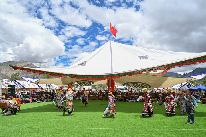 民間藏戲表演隊在西藏南木林縣非遺公園內(nèi)表演湘巴藏戲(2025年7月16日攝)。新華社記者 李鑫 攝