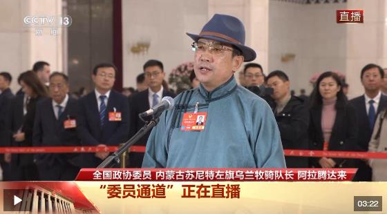 今天(3月10日),全國(guó)政協(xié)十四屆三次會(huì)議第三場(chǎng)“委員通道”在人民大會(huì)堂舉行,全國(guó)政協(xié)委員、內(nèi)蒙古蘇尼特左旗烏蘭牧騎隊(duì)長(zhǎng)阿拉騰達(dá)來(lái)接受了記者采訪。