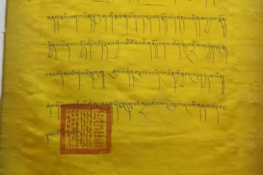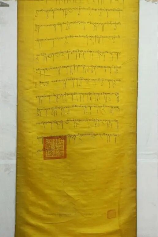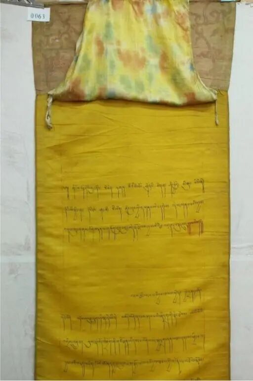 西藏博物館收藏著一份六世達(dá)賴?yán)锇l(fā)布的文告(圖一)。這份發(fā)布于1700年(藏歷鐵龍年)的文件,書寫于黃色絲綢上,裝裱華麗如唐卡。