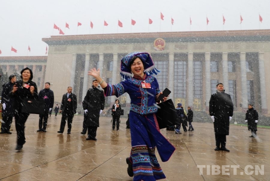 3月4日上午,十四屆全國人大四次會議舉行預備會議。會后,一場春雪不期而至。走出會場的全國人大代表、廣西金秀瑤族自治縣桐木中學副校長梁麗斌向記者們揮手致意。