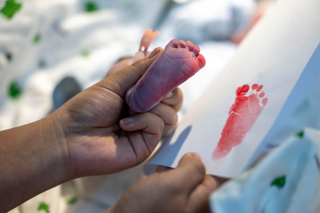 2026年1月1日,西藏自治區(qū)人民醫(yī)院婦產(chǎn)科助產(chǎn)醫(yī)生次拉為新生兒印腳印。新華社記者 旦增尼瑪曲珠 攝